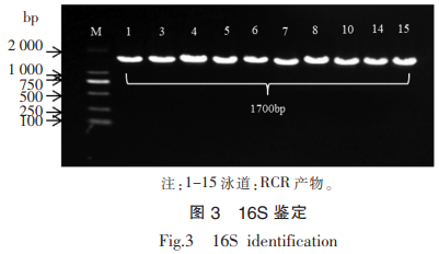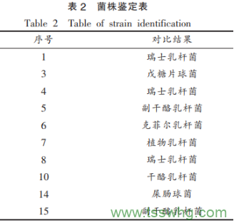 選取CLA含量最高的10株菌提取基因組DNA進(jìn)行16SrDNA鑒定,結(jié)果如圖3所示。篩選菌株均在1700bp左右有特異性條帶,送交公司測序。測序結(jié)果在NCBI中比對后如表2所示,其中瑞士乳桿菌3株,副干酪乳桿菌2株,戊糖片球菌、克菲爾乳桿菌、植物乳桿菌、屎腸球菌各1株,選擇CLA產(chǎn)量最高的植物乳桿菌,命名為HB-01測定其發(fā)酵性質(zhì)。