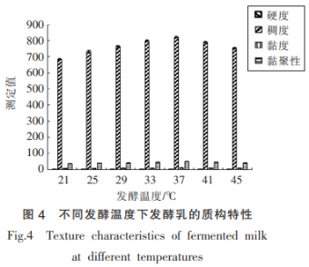 不同發(fā)酵溫度所得發(fā)酵乳的質(zhì)構(gòu)結(jié)果表明,硬度、黏度、膠著性和咀嚼性隨溫度的增加呈先上升后下降的趨勢,在37℃時發(fā)酵乳的硬度最大(0.2300±0.0100)N。不同發(fā)酵時間所得發(fā)酵乳的質(zhì)構(gòu)結(jié)果表明,硬度、黏度、膠著性和咀嚼性的值在36h為最大值,硬度最大為(0.2467±0.0058)N,發(fā)酵性能更好。不同接種量所得發(fā)酵乳的質(zhì)構(gòu)結(jié)果表明,硬度、黏度、膠著性和咀嚼性的值在4%為最大值,硬度最大為(0.2567±0.0115)N。不同pH值所得發(fā)酵乳的質(zhì)構(gòu)結(jié)果表明,硬度、黏度、膠著性和咀嚼性的值隨pH值的變化不大,在pH值為6.5時硬度最大為(0.2200±0.0100)N。不同LA添加量所得發(fā)酵乳的質(zhì)構(gòu)結(jié)果表明,硬度、黏度、膠著性和咀嚼性的值隨LA添加量的變化不大,在0.5mg/mL時硬度最大為(0.2333±0.0115)N。