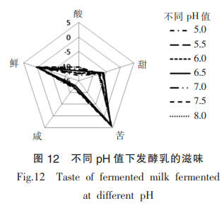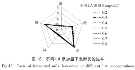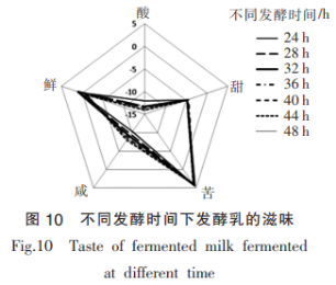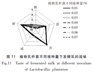 植物乳桿菌接種純牛奶進(jìn)行發(fā)酵試驗(yàn),發(fā)酵乳經(jīng)電子舌檢測結(jié)果如圖9~圖13所示。結(jié)果顯示,溫度、接種量和pH值對成品的酸度影響較大,隨著溫度的升高酸度逐漸加強(qiáng),甜味、苦味、咸味和鮮味無明顯變化,發(fā)酵時(shí)間和LA添加量與5種滋味的關(guān)聯(lián)性也不大,所以選擇適宜的發(fā)酵溫度、接種量和pH值有利于得到滋味更好的發(fā)酵乳。