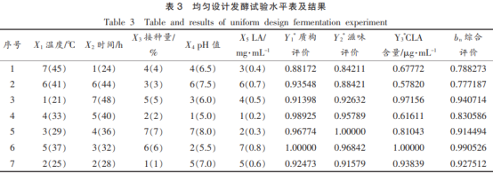 發(fā)酵乳樣品經(jīng)篩選鑒定一株CLA產(chǎn)量相對較高的植物乳桿菌,利用單因素試驗(yàn)和均勻設(shè)計(jì)試驗(yàn)優(yōu)化植物乳桿菌發(fā)酵性能,結(jié)果顯示,在接種量4%,LA添加量為0.7mg/mL,pH6.5、37℃條件下發(fā)酵32h,4℃后熟12h,發(fā)酵乳的性能較好,CLA含量最高。均勻設(shè)計(jì)的優(yōu)化結(jié)果與其相似,為后續(xù)基因改造植物乳桿菌,提高CLA產(chǎn)能和CLA生成機(jī)理研究奠定一定基礎(chǔ)。