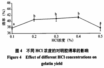圖4顯示,隨著HCl濃度的增大,明膠的得率呈現(xiàn)先上升再下降的趨勢。0.4%HCl濃度,得率最高(41.33%),這是由于HCI可以使膠原分子的膨脹而變得松散,從而更利于熱水提膠時(shí)明膠的溶出。此外,酸液還有利于中鈣質(zhì)的脫除,從而利于明膠的提取。但當(dāng)濃度提高到0.5%時(shí),明膠的得率有顯著的下降,這可能是膠原分子因?yàn)樗釢舛冗^高而過度膨脹,使膠原蛋白發(fā)生溶解。因此,最終確定提取明膠的最佳HCl濃度為0.4%。