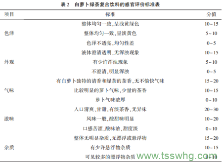 首先參考文獻(xiàn)以及預(yù)實(shí)驗(yàn),制定白蘿卜綠茶復(fù)合飲料的感官評(píng)價(jià)標(biāo)準(zhǔn),如表2所示。