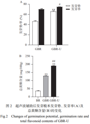糙米發(fā)芽勢(shì)和發(fā)芽率結(jié)果如圖2A所示,超聲波輔助糙米發(fā)芽組發(fā)芽勢(shì)為65.82%(P<0.01),發(fā)芽率為75.02%(P<0.05),較未超聲處理組分別增加了19.60%和4.66%。這可能與超聲波可以促進(jìn)谷物代謝,加快細(xì)胞吸水膨脹從而使種子發(fā)芽速率增加有關(guān)。