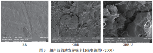 圖3為發(fā)芽糙米表皮掃描電鏡分析結(jié)果。從圖3中可以看到,未發(fā)芽糙米表皮光滑致密無空隙;發(fā)芽后,糙米皮層變得松散;而超聲波輔助處理后發(fā)芽糙米的表皮結(jié)構(gòu)變得更加疏松,空隙也變得更大,這說明超聲波可以破壞糙米皮層的致密程度。同樣,用超聲波處理金蕎麥粉末后,其細(xì)胞結(jié)構(gòu)被破壞,變得疏松多孔。Yang等研究也發(fā)現(xiàn)超聲波產(chǎn)生的空化和機(jī)械作用使得糙米表皮發(fā)生了不同程度的變形并產(chǎn)生了裂痕,從而使糙米皮層變得更疏松多孔。