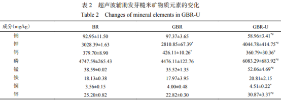 此外,發(fā)芽糙米中礦物質(zhì)元素含量分析如表2所示。結(jié)果表明,與BR相比,GBR組發(fā)芽糙米中鈣的含量顯著升高12.22%(P<0.05),而鉀的含量顯著降低7.18%(P<0.05)。與GBR組發(fā)芽糙米相比,超聲波輔助處理可使發(fā)芽糙米中鉀、磷、錳和鋅分別顯著升高43.90%、35.91%、46.57%和35.28%(P<0.05),而鈉和鈣分別顯著降低39.45%和15.33%(P<0.05)。關(guān)于礦物元素的上述變化,一方面可能是由于種子發(fā)芽時(shí),胚芽的生長(zhǎng)需要礦物質(zhì),礦物質(zhì)可作為輔助因子協(xié)助催化蛋白質(zhì)和碳水化合物的分解和利用,造成部分礦物質(zhì)被消耗;另一方面是由于種子中的無機(jī)物大部分是與有機(jī)物結(jié)合的形式存在,隨著種子的萌發(fā)而轉(zhuǎn)變成游離態(tài)。此外,利用超聲波處理,其空化作用及熱效應(yīng)也可能促進(jìn)無機(jī)物的釋放。
