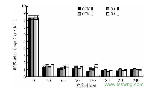 呼吸強度是衡量水果物質(zhì)消耗的重要指標(biāo)之一。由圖10可知,本試驗紅香酥梨在低溫條件下各處理均未發(fā)現(xiàn)明顯的呼吸高峰。貯藏初期紅香酥梨的呼吸強度仍然很大,隨著時間的延長呼吸強度逐漸下降;2種套袋處理的呼吸強度要高于2種裸果處理,裸果急速降溫處理(0CKⅡ)的呼吸強度最低。180d之前緩降溫PE打孔袋處理(0AⅠ)的呼吸強度高于急速降溫PE打孔袋處理(0AⅡ),180d之后下降至低于0AⅡ,與0CKⅠ和0CKⅡ趨同。