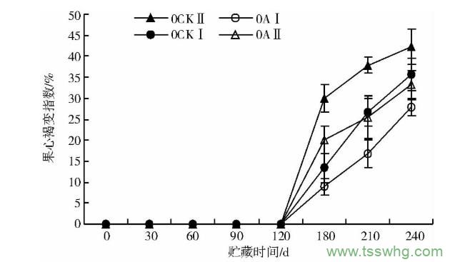 從圖12可以看出,各處理120d前均未發(fā)現(xiàn)果心褐變。裸果急速降溫處理(0CKⅡ)的果心褐變指數(shù)顯著高于其他3個處理,緩降溫PE打孔袋處理(0AⅠ)果心褐變指數(shù)最低,在240d時27.78%;急速降溫裸果處理(0CKⅠ)180d時果心褐變指數(shù)低于0AⅡ,后快速增長,在210d時超過了0AⅡ,達到25.56%。