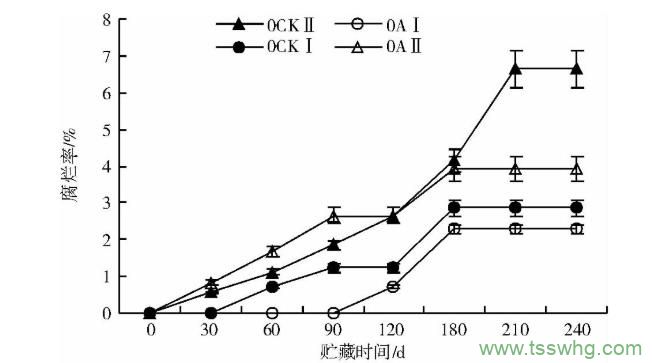 腐爛率高一直是紅香酥梨貯藏后期的一個嚴重問題。從圖11可以看出,除120、180d的0CKⅡ和0AⅡ外,各處理腐爛率差異顯著(P<0.05):2種急速降溫處理(0CKⅡ和0AⅡ)從貯藏30d就開始有腐爛果;而裸果緩降溫處理(0CKⅠ)60d出現(xiàn)腐爛果,緩降溫PE打孔袋處理(0AⅠ)在120d時出現(xiàn)腐爛果。貯藏至210d時,0CKⅡ處理腐爛率最高,達到6.64%;0AⅡ、0CKⅠ、0AⅠ處理腐爛率分別是3.92%、2.85%和2.28%。緩降溫PE打孔袋處理(0AⅠ)的腐爛率顯著低于其他3個處理。