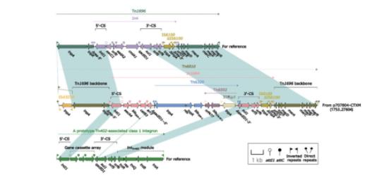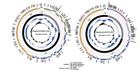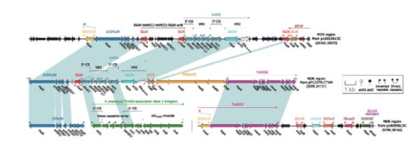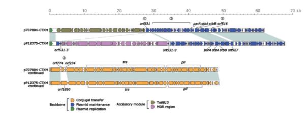 p707804?CTXM和pP12375?CTXM均只含一個MDR區(qū)。p707804?CTXM中Tn6810為新型轉(zhuǎn)座子,包含β?內(nèi)酰胺類耐藥基因blaCTX?M?3、blaOXA?1和blaTEM?1,氨基糖苷類耐藥基因aacA4,氯霉素耐藥基因catB3,利福平耐藥基因arr3以及磺胺類耐藥基因sul1。