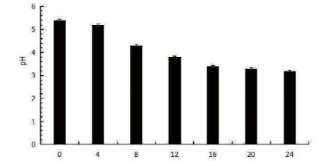 取植物乳桿菌R-21斜面保藏菌種轉(zhuǎn)接于10mlMRS液體培養(yǎng)基中,37℃、150rpm震蕩培養(yǎng)24h。取2ml種子液轉(zhuǎn)接于200mlMRS液體培養(yǎng)基中,37℃、150rpm震蕩培養(yǎng)24h。期間分別取0h、4h、8h、12h、16h、20h、24h的樣品各5ml,檢測(cè)各時(shí)間點(diǎn)發(fā)酵液pH值。余下乳酸菌發(fā)酵液置于4℃?zhèn)溆谩?/p>