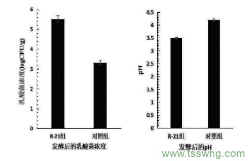 采用厭氧罐培養(yǎng)法檢測(cè)發(fā)酵120d后飼料中乳酸菌的活菌數(shù)對(duì)數(shù)值,使用筆式pH計(jì)檢測(cè)兩組發(fā)料飼料的pH。結(jié)果如圖2所示,添加植物乳桿菌R-21的青貯飼料中,其最終的乳酸菌活菌數(shù)對(duì)數(shù)值為5.51,比對(duì)照組高2.19;pH約為3.5,較對(duì)照組低0.7。表明植物乳桿菌R-21能顯著增加青貯飼料中乳酸菌活菌的終濃度,并降低其pH(P≤0.05)。乳酸菌濃度和pH是衡量青貯飼料優(yōu)劣的兩個(gè)重要指標(biāo)。一般情況下,乳酸菌濃度越高,其產(chǎn)酸能力越強(qiáng),越有利于維持飼料的生物穩(wěn)定性。乳酸菌是益生菌,有利于促進(jìn)動(dòng)物腸道健康,增強(qiáng)動(dòng)物非特異免疫力,預(yù)防與治療細(xì)菌性腹瀉,具有重要的應(yīng)用價(jià)值。