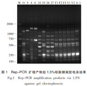 以細(xì)菌基因組DNA為模板,參考Silva等的方法,利用設(shè)計(jì)的BOX引物(引物序列見表2)進(jìn)行rep-PCR擴(kuò)增。待擴(kuò)增完成后,將PCR產(chǎn)物進(jìn)行1.5%的瓊脂糖凝膠電泳并在UV燈下觀察電泳結(jié)果。