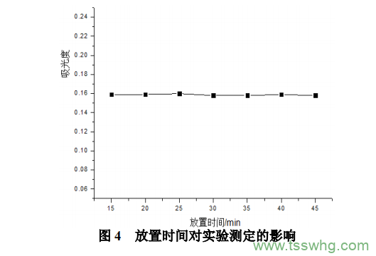 取 7 個 25 mL 容量瓶,在每一個容量中準(zhǔn)確移取 2.00 mL 鐵的標(biāo)準(zhǔn)溶液,然后再依次加入 5.00 mL 乙酸-乙酸鈉緩沖溶液 2.00 mL 抗壞血酸,2.00 mL 鄰二氮菲溶液,最后用蒸餾水定容至刻度,搖勻,分別放置 15 min、20 min、25 min、30 min、35 min、40 min、45 min 后于 510 nm 處測其吸光度。