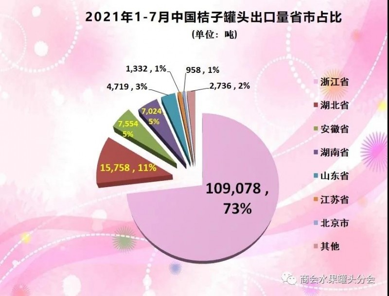 其中,浙江省出口量10.91萬噸,占全國出口桔子罐頭總量的73%,金額1.30億美元,同比數(shù)量減少9%,金額降低12%,單價(jià)減少4%;