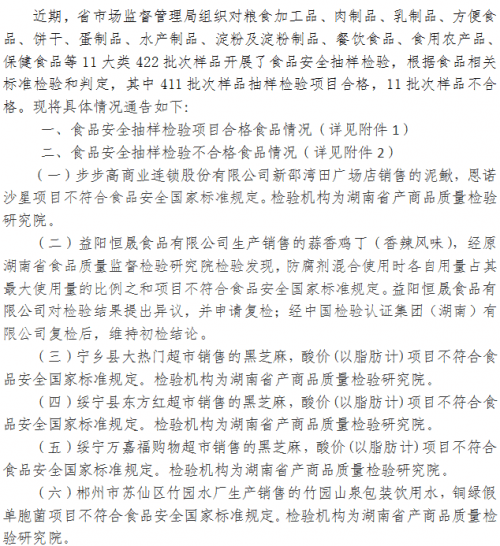 湖南省市場監(jiān)督管理局關(guān)于422批次食品安全抽樣檢驗(yàn)情況的通告(2021年第14期)
