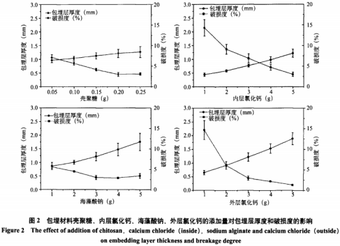 對(duì)包埋實(shí)際效果不錯(cuò)的里層構(gòu)造為殼聚糖和氯化鈣,表層構(gòu)造為海藻酸鈉和氯化鈣的包埋層開展單要素科學(xué)研究,結(jié)果見圖2。