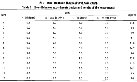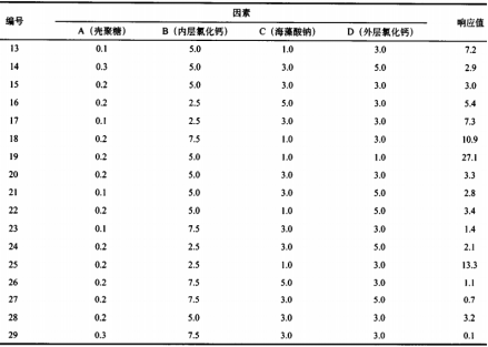 挑選殼聚糖加上量、里層氯化鈣加上量、海藻酸鈉加上量和表層氯化鈣加上量做為四個(gè)必須提升的技術(shù)主要參數(shù),以燕麥片顆粒物的損壞度做為實(shí)體模型調(diào)優(yōu)的自變量,29組單獨(dú)研究的效果見表3。