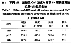 青稞β-聚糖為一種生物大分子粘性含糖量,其分子結(jié)構(gòu)根據(jù)共價鍵等功效開展集聚、化學交聯(lián)、盤繞,因而具備疑膠特點。其相對性相對分子質(zhì)量在9×103~12×103,易產(chǎn)生疑膠,產(chǎn)生速率隨質(zhì)量濃度的提高而加速。而pH、綿白糖濃度值及Ca2 等的添加,也會危害青稞β-聚糖疑膠的質(zhì)構(gòu)特點,見表1。數(shù)據(jù)顯示,在弱酸性情況下,質(zhì)量濃度較高的青稞β-聚糖所建立的疑膠具備較優(yōu)質(zhì)的質(zhì)構(gòu)特點,加上綿白糖能夠 提升疑膠抗壓強度,Ca2 的添加則減少了青稞β-聚糖疑膠的抗壓強度。現(xiàn)階段已經(jīng)有防噎水晶果凍中運用青稞β-聚糖做為水晶果凍疑膠輔材,也將其做為鼻用膏劑栽培基質(zhì)用以診療層面。
