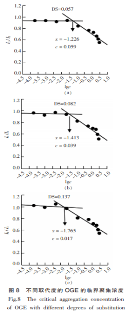 芘在330nm的激起光波長(zhǎng)下熒光光譜中會(huì)發(fā)生4個(gè)震動(dòng)峰,各自為I1(374nm)、I2(380nm)、I3(385nm)和I4(394nm)。當(dāng)高聚物的含量較低時(shí),其只以多肽鏈方式存有,瑩光抗壓強(qiáng)度不產(chǎn)生變化,殊不知當(dāng)濃度值高過(guò)CAC時(shí),芘分子結(jié)構(gòu)會(huì)加入到親水性核心并明顯發(fā)送,造成 瑩光抗壓強(qiáng)度提升,產(chǎn)生膠束。I1/I3值的高低體現(xiàn)出水溶液的旋光性尺寸,即標(biāo)值越小,相匹配其旋光性也越小。當(dāng)I1/I3的值發(fā)生驟降時(shí),能夠 覺(jué)得芘由水里慢慢遷移至自集聚納米顆粒的親水性?xún)?nèi)殼中,代表著自聚集體的真正產(chǎn)生。在圖8中還可以發(fā)覺(jué),OGE的DS與CAC成成反比,即隨OGE取代度的提升,臨界值膠束濃度值越小。當(dāng)DS=0.057,測(cè)出其CAC為0.059mg/mL;當(dāng)DS=0.082時(shí),其CAC為0.039mg/mL;當(dāng)DS=0.133時(shí),其CAC降到0.017mg/mL。與文獻(xiàn)資料報(bào)導(dǎo)的兩親性含糖量在較低濃度下就可以產(chǎn)生自集聚膠束的結(jié)果一致。
