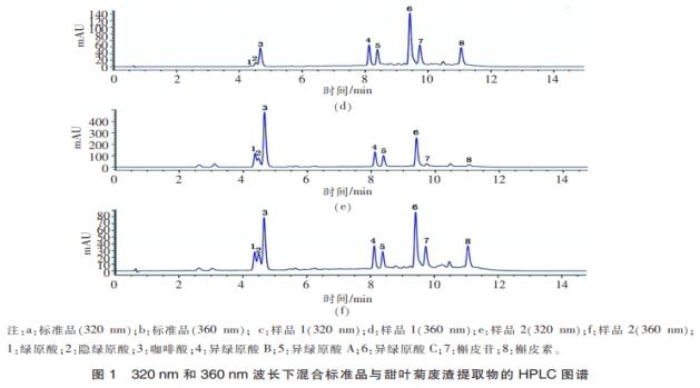 依照甜葉菊廢料提取液的主要成分為咖啡酸、綠原酸、隱綠原酸、異綠原酸A、異綠原酸B、異綠原酸C、原兒茶醛和槲皮苷。選用HPLC法對二種甜葉菊廢料提取液中的主要成分開展定性分析。高效率液相色譜儀標準為:AgilentEclipsePlusC18色譜柱(50mm×2.1mm,1.8μm),流動性相為0.1%苯甲酸(A)和工業(yè)甲醇(B),流動速度0.1mL/min。過柱程序流程:0~10min,10%~50%(B);10~12min,50%~10%(B);12~15min,10%(B)。檢驗光波長320nm和360nm,柱溫30℃,進樣量1μL。選用咖啡酸、綠原酸、隱綠原酸、異綠原酸A、異綠原酸B、異綠原酸C、原兒茶醛和槲皮苷為標準物質(zhì),按以上色譜儀標準各自測量。以標準物質(zhì)的質(zhì)量摩爾濃度為橫坐標軸,峰總面積為縱軸,制作HPLC標曲,并測量二種甜葉菊廢料提取液中各主要成分的成分,根據(jù)與標準物質(zhì)出峰時間相較為,從甜葉菊廢料提取液中分離出來并檢驗到6種酚酸(320nm)和2種黃酮類(360nm),如圖所示1所顯示。選用外標法對以上8種主要成分成分開展測量,結(jié)果見表2。試品1中總酚酸的成分為(472.01±2.28)mg/g,黃酮類物質(zhì)的成分為(75.27±1.37)mg/g,在其中占比最多的3種成份先后為異綠原酸C(158.91±1.00)mg/g、異綠原酸B(116.39±0.57)mg/g和咖啡酸(105.67±0.37)mg/g。試品2中總酚酸的成分為(424.41±5.01)mg/g,黃酮類物質(zhì)的成分為(46.4±2.36)mg/g,在其中占比最多的3種成份先后為咖啡酸(146.47±1.68)mg/g、異綠原酸C(88.73±1.05)mg/g和異綠原酸B(67.38±0.82)mg/g。從效果中看得出,二種甜葉菊廢料提取液都含有酚酸和黃酮類化合物、多糖類化學物質(zhì),在其中,試品1中酚酸和黃酮類化合物、多糖類化學物質(zhì)的總數(shù)量均超過試品2,且二種試品各構(gòu)成成份成分中間也存有差別,試品1綠原酸類物質(zhì)占比較多,試品2咖啡酸成分較多。這種成份具備各種生物活性,如降低膽固醇,抗氧化性,抗發(fā)炎,延緩衰老等。因而對甜葉菊廢料提取液開展科學研究,能為其進一步開發(fā)設(shè)計運用給予根據(jù)。