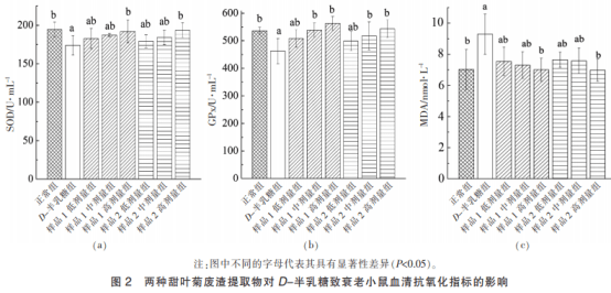 由圖2得知,D-半乳糖組小白鼠的血清蛋白SOD和GPx魅力顯著明顯低于正常組(P<0.05),MDA成分顯著高過一切正常對照實驗(P<0.05),說明經(jīng)D-半乳糖誘發(fā),小白鼠血清蛋白內(nèi)的清除自由基活力降低,脂質(zhì)過氧化物顯著增加。二種甜葉菊廢料提取液小劑量組小白鼠血清蛋白SOD和GPx魅力,MDA成分與D-半乳糖組對比均無顯著性差異(P>0.05);二種甜葉菊廢料提取液的中使用量組小白鼠血清蛋白GPx魅力較D-半乳糖組各自明顯提高了16.39%和11.88%(P<0.05),而小白鼠血清蛋白SOD魅力和MDA成分與D-半乳糖組對比均無顯著性差異(P>0.05);二種甜葉菊廢料提取液高使用量組可以使D-半乳糖解決的小白鼠血清蛋白SOD和GPx魅力上升,MDA成分減少,在其中試品1高使用量組SOD和GPx魅力各自明顯提升10.32%和21.67%(P<0.05),MDA成分減少了24.5%(P<0.05),試品2高使用量組SOD和GPx魅力各自明顯提升11.28%和17.42%,MDA成分減少了24.8%(P<0.05)。二種甜葉菊廢料提取液中間對比,對D-半乳糖解決小白鼠血清蛋白抗氧化性指標值(SOD,GPx和MDA)的危害無顯著性差異(P>0.05)。綜合性之上結(jié)果顯示,二種甜葉菊廢料提取液有利于D半乳糖誘發(fā)變老小白鼠消除血清蛋白脂質(zhì)過氧化物,提升血清蛋白抗氧化酶魅力,提高人體免疫力的工作能力。