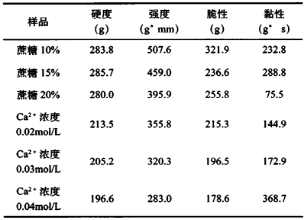 青稞β-聚糖為一種生物大分子粘性含糖量,其分子結(jié)構(gòu)根據(jù)共價(jià)鍵等功效開展集聚、化學(xué)交聯(lián)、盤繞,因而具備疑膠特點(diǎn)。其相對(duì)性相對(duì)分子質(zhì)量在9×103~12×103,易產(chǎn)生疑膠,產(chǎn)生速率隨質(zhì)量濃度的提高而加速。而pH、綿白糖濃度值及Ca2 等的添加,也會(huì)危害青稞β-聚糖疑膠的質(zhì)構(gòu)特點(diǎn),見表1。數(shù)據(jù)顯示,在弱酸性情況下,質(zhì)量濃度較高的青稞β-聚糖所建立的疑膠具備較優(yōu)質(zhì)的質(zhì)構(gòu)特點(diǎn),加上綿白糖能夠 提升疑膠抗壓強(qiáng)度,Ca2 的添加則減少了青稞β-聚糖疑膠的抗壓強(qiáng)度。現(xiàn)階段已經(jīng)有防噎水晶果凍中運(yùn)用青稞β-聚糖做為水晶果凍疑膠輔材,也將其做為鼻用膏劑栽培基質(zhì)用以診療層面。