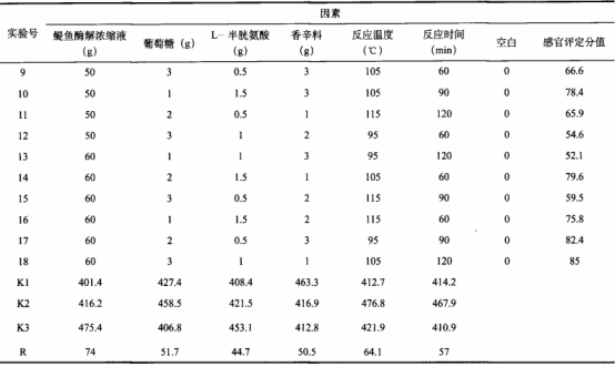 本試驗(yàn)挑選鳀魚(yú)酶解提取液(25%)、葡萄糖水、L-胱胺酸、調(diào)味料、反映溫度、反應(yīng)速度為美拉德反應(yīng)關(guān)鍵影響因素,每一個(gè)要素設(shè)置3個(gè)水準(zhǔn),創(chuàng)建L18(37)正交表開(kāi)展美拉德反應(yīng)試驗(yàn)。以感觀鑒定的均分做為結(jié)果,明確美拉德反應(yīng)最佳加工工藝。調(diào)味料水準(zhǔn)及配制見(jiàn)表2。正交試驗(yàn)及感觀點(diǎn)評(píng)結(jié)果如表3所顯示。