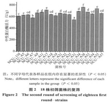 點(diǎn)種取決于調(diào)查優(yōu)質(zhì)菌種是不是能在集中的培育中仍能保持較高的中性蛋白酶魅力,而且規(guī)定菌種的發(fā)育速度快,對(duì)自然環(huán)境適應(yīng)能力強(qiáng)。菌種正基因突變主要表現(xiàn)為菌體漲勢(shì)好而且K值比對(duì)比值大。由表1得知,18株初篩菌種的K值均超過(guò)初始菌種,其產(chǎn)中性蛋白酶工作能力很有可能好于初始菌種,在其中菌種NCU—A38、NCU—A55、NCu—A17菌體漲勢(shì)不錯(cuò),且全透明圈直徑較大 ,各自為25.6、23.5、23.5mm,而他們的K值則各自實(shí)現(xiàn)了2.08、2.04、1.77。袁艷玲研究表明,根據(jù)K值挑選正基因突變株高效率,但菌種的產(chǎn)中性蛋白酶工作能力與K值并并不是呈規(guī)律性的線性相關(guān)。因此必須 進(jìn)一步的復(fù)篩來(lái)明確最后增產(chǎn)中性蛋白酶活的基因突變株,試驗(yàn)選用淺盤酒曲制作測(cè)量中性蛋白酶活給予認(rèn)證。