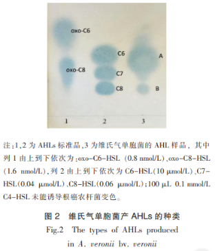 根癌農(nóng)桿菌對不一樣碳鏈的長度或含有不一樣官能團(tuán)的AHLS分子結(jié)構(gòu)比較敏感層度不一樣,這種AHLS經(jīng)TLc進(jìn)行,在培養(yǎng)液相對應(yīng)的部位誘發(fā)根癌農(nóng)桿菌展現(xiàn)深藍(lán)色色斑。依據(jù)色斑的比移值、樣子和色調(diào)深、淺可直接分辨AHLS的類型及相對性成分。對維氏氣單胞菌的AHLS萃取液的TLc剖析結(jié)果見圖2。剖析得知,該病菌最少造成3種AHLS分子結(jié)構(gòu),即:c6-HSL、c7-HSL和c8-HSL。c4-HSL與c6-HSL是現(xiàn)階段氣單胞菌屬報導(dǎo)數(shù)最多的2種AHLS信號分子。LI等在腐壞比目魚中分離出來的柔和氣單胞菌中檢查到c4-HSL、c6-HSL、c8-HSL、N-癸?;?高絲氨酸內(nèi)酯(c10-HSL)和n十二酰基-高絲氨酸內(nèi)酯(c12-HSL)。本實(shí)驗(yàn)在維氏氣單胞菌中檢查到主鏈上的氧原子數(shù)量為質(zhì)數(shù)的AHL信號分子,即c7-HSL。