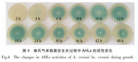 病菌形成的AHLS分子結(jié)構(gòu)濃度值受病菌相對密度轉(zhuǎn)變 危害,不一樣發(fā)育環(huán)節(jié)的病菌AHLS萃取液能誘發(fā)根癌農(nóng)桿菌造成不一樣孔徑的深藍(lán)色圈。維氏氣單胞菌生長發(fā)育歷程中的病菌數(shù)量與細(xì)胞培養(yǎng)液PH值的轉(zhuǎn)變 見圖3,AHLS活力轉(zhuǎn)變 見圖4。剖析得知,尿培養(yǎng)4h時處在多數(shù)成長期前期,這時病菌代謝的AHLS可誘發(fā)根癌農(nóng)桿菌顯深藍(lán)色。在4~10h病菌的迅速成長環(huán)節(jié),根癌農(nóng)桿菌的掉色直徑持續(xù)擴(kuò)大,表明AHLS的成分迅速積累。在10~18h時,根癌農(nóng)桿菌深藍(lán)色圈的孔徑較大 ,這時細(xì)胞培養(yǎng)液中AHLS濃度值最大。在18~48h,病菌處在生長發(fā)育穩(wěn)定型,誘發(fā)匯報菌掉色的直徑減少,表明AHLS的濃度值逐漸減少。研究發(fā)現(xiàn),AHLS成分的降低與自然環(huán)境PH值上升相關(guān)。AHLS的高絲氨酸內(nèi)酯環(huán)在偏堿情況下構(gòu)造不穩(wěn)定,易解環(huán)。對病菌生長發(fā)育歷程中細(xì)胞培養(yǎng)液的PH值轉(zhuǎn)變的分析表明:尿培養(yǎng)18h后細(xì)胞培養(yǎng)液的PH值由6.92升至8.11,塑造48h時PH值達(dá)8.97。伴隨著病菌的生長發(fā)育,細(xì)胞培養(yǎng)液的PH值持續(xù)上升,AHLS逐漸溶解,活力減少。