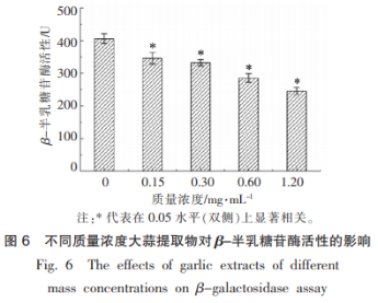 根據(jù)檢驗(yàn)微生物匯報菌根癌農(nóng)桿菌的β-半乳糖苷酶促反應(yīng)來剖析不一樣濃度值大蒜提取物對維氏氣單胞菌造成AHLS活力的影響功效,結(jié)果見圖6。剖析得知,伴隨著大蒜提取物濃度值的提升(0~1.20mg/mL),根癌農(nóng)桿菌的β-半乳糖苷酶促反應(yīng)持續(xù)減少(P<0.05)。這表明大蒜提取物對維氏氣單胞菌產(chǎn)AHLS活力具備明顯的抑制效果(P<0.05),且大蒜提取物的濃度值與其說人群磁感應(yīng)抑止活力呈顯著量效關(guān)聯(lián)。大蒜提取物濃度值為1.20mg/mL時對根癌農(nóng)桿菌的β-半乳甘酶活力的抑制率最大,為39.6%。這有可能是由于此濃度值下維氏氣單胞菌AcuR蛋白質(zhì)與人群磁感應(yīng)抑止活性物質(zhì)的結(jié)合性最強(qiáng),抑止了AHLS分子結(jié)構(gòu)的基因表達(dá)表述。