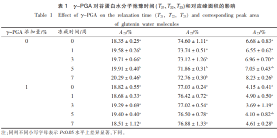 1為γ-PGA對谷蛋白水分弛豫時間(T21、T22、T23)和相匹配峰總面積的危害,谷蛋白中水分是由束縛水T21、弱束縛水T22和自由水T23三一部分水份構(gòu)成。得知隨凍藏時間提升,空缺組中弱束縛水呈下降趨勢,而自由水成分卻由6.7%上下明顯擴大至8.2%上下,這是由于凍藏期內(nèi)冰霜的重結(jié)晶狀況促使谷蛋白中間的化學(xué)交聯(lián)功效變?nèi)酰斐?蛋白質(zhì)與水的融合水平減少,引起一部分弱束縛水向自由水轉(zhuǎn)換。而在γ-PGA組,發(fā)覺凍藏前期其自由水成分比空缺組小2.5%,而弱束縛水相對性成分卻增大,說明γ-PGA的加上更改了谷蛋白的水份遍布,較少的自由水使其更為平穩(wěn)。與此同時γPGA合理遏制了谷蛋白凍藏期內(nèi)的水份轉(zhuǎn)移,凍藏7星期過后其自由水成分較空缺組低3.5%。比照γPGA對面條蛋白質(zhì)凍藏期內(nèi)水份轉(zhuǎn)變 危害,實驗發(fā)覺谷蛋白與面條蛋白質(zhì)凍藏期內(nèi)弱束縛水和自由水的趨勢分析一致,從而說明γ-PGA根據(jù)抑止谷蛋白的水份轉(zhuǎn)移進而影響到了面條蛋白質(zhì)凍藏期內(nèi)的水份轉(zhuǎn)移。