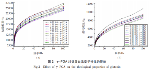 黏延展性被覺得是點評面糊質(zhì)量的主要標準之一,而谷蛋白是彈力的關(guān)鍵奉獻要素。谷蛋白流變學(xué)精確測量的彈性模具(G′)和粘性應(yīng)變速率(G″)如圖2所顯示。與面條蛋白質(zhì)相一致,谷蛋白在頻率0.1~100Hz范疇內(nèi)其G′和G″都伴隨著次數(shù)的提高慢慢擴大,且G′自始至終超過G″。當凍藏時間增加,谷蛋白的彈性模具(G′)和粘性應(yīng)變速率(G″)均出現(xiàn)降低的發(fā)展趨勢,這與Xuan等科學(xué)研究結(jié)果保持一致。而加入了1%的γ-PGA后,盡管凍藏前期谷蛋白的彈性模具(G′)小于空缺組,但其遭受凍藏危害的程度小,凍藏7星期過后其彈性模具(G′)比空缺組高,說明其合理遏制了凍藏造成 的谷蛋白延展性的減少,而粘性應(yīng)變速率(G″)卻與之反過來,在凍藏前后左右其粘性特性均小于空缺組,這說明γ-PGA并沒有對谷蛋白的粘性特性造成積極主動功效,先人科學(xué)研究也發(fā)覺面糊及面條蛋白質(zhì)的彈力特性主要是由谷蛋白起首要奉獻,故實驗結(jié)果顯示γ-PGA并無法根據(jù)更改谷蛋白的粘性特性來緩解凍藏期內(nèi)面條蛋白質(zhì)粘性特性的劣變,但還可以利用對谷蛋白延展性的干擾來抑止面條蛋白質(zhì)延展性的變?nèi)酢?/p>