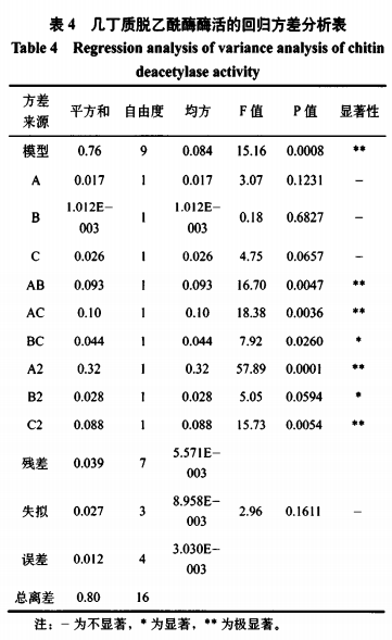 由表4得知:實(shí)體模型P<0.01,說明該方程式實(shí)體模型極明顯,不一樣解決間的差異極明顯;失擬項(xiàng)P>0.05,說明實(shí)體模型失擬項(xiàng)不明顯l從F值的多少能夠獲得,一次項(xiàng)中各要素對幾丁質(zhì)脫乙酰酶酶活的危害次序是C>A>B,互動相對性酶活危害的層次次序?yàn)锳C>AB>BC。實(shí)體模型的R2為0.9512,表明該實(shí)體模型能表述95.12%響應(yīng)值的轉(zhuǎn)變,因此該實(shí)體模型擬合程度優(yōu)良,試驗(yàn)誤差小,能夠用以預(yù)測分析最佳發(fā)醇標(biāo)準(zhǔn)主要參數(shù)。結(jié)果顯示,最好發(fā)醇標(biāo)準(zhǔn)為:木薯淀粉1.09%、ZnS040.05%、pH7.86,預(yù)估酶活2.01U/mL。聯(lián)系實(shí)際,大家將發(fā)醇標(biāo)準(zhǔn)調(diào)節(jié)為木薯淀粉1.1%、ZnSO40.05%、pH7.9。歷經(jīng)中后期認(rèn)證測出酶活2.06U/mL。與預(yù)估基本上合乎。比提升以前增強(qiáng)了1.41倍。提升后菌種MCDA02發(fā)醇產(chǎn)CDA水準(zhǔn)為2.06U/mL,小于一部分報導(dǎo)的病菌發(fā)醇幾丁質(zhì)脫乙酰酶的發(fā)醇水準(zhǔn)。