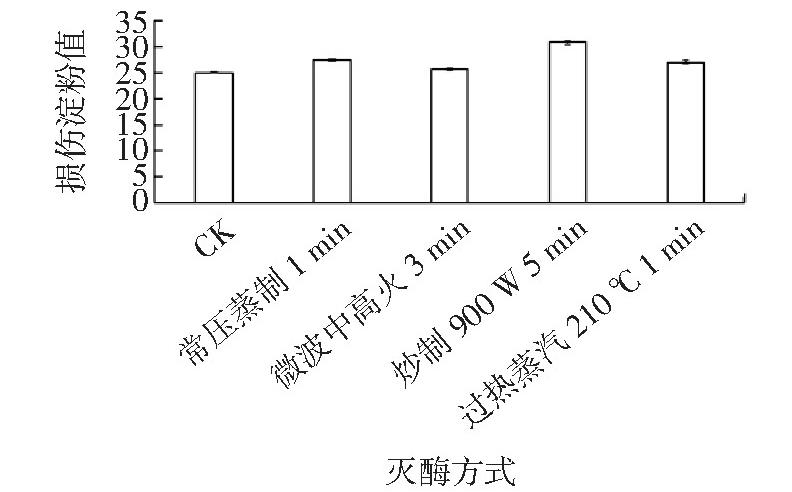 未滅酶青稞全粉的損害木薯淀粉數(shù)值25.05,由圖6能夠看得出,滅酶解決會(huì)使青稞全粉的損害木薯淀粉值提升,增長(zhǎng)幅度為2.20%~28.93%,在其中炮制滅酶解決的危害較大 ,促使損害木薯淀粉值提高了28.93%,這也是因?yàn)樵跍缑溉^(guò)程中,水和熱的功能使面粉中木薯淀粉顆粒物結(jié)晶體區(qū)毀壞資產(chǎn)重組,造成 損害木薯淀粉值提高。損害木薯淀粉值的增多會(huì)對(duì)小麥面粉的生產(chǎn)加工質(zhì)量導(dǎo)致一定危害,如損害木薯淀粉易吸濕澎漲,損害木薯淀粉越更多就是吸水性越高,易沾手等,危害制作工藝和服用質(zhì)量。