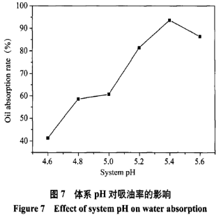 從圖7能夠看得出,在管理體系pH4.6~5.4轉(zhuǎn)變 區(qū)段內(nèi),伴隨著pH的持續(xù)擴(kuò)大,即水溶液酸堿性的慢慢變?nèi)酰嗫捉Y(jié)構(gòu)木薯淀粉的吸油率慢慢上升;在管理體系pH5.4以后,伴隨著緩沖液pH的擴(kuò)大(水溶液酸堿性的變?nèi)酰?,多孔結(jié)構(gòu)木薯淀粉的吸油率減少;多孔結(jié)構(gòu)木薯淀粉吸油率在pH=5.4處為最高值。