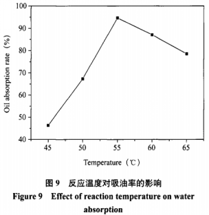 反映溫度挑選45℃、50℃、55℃、60℃、65℃,別的主要參數(shù)挑選為:微波加熱輸出功率160W、微波加熱時間40min、管理體系pH5.2、加酶量9U/g、超音波輸出功率400W,吸油率如圖所示9所顯示。