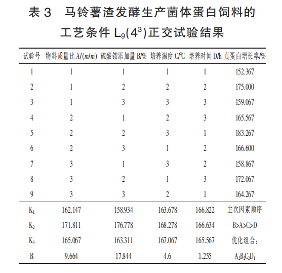 依據(jù)提升發(fā)醇加工工藝明確最好情況為土豆薯渣固體原材料塑造 基:薯渣∶麥麩=85∶15,硫酸銨加上量 2.0%,發(fā)醇溫 度 32 ℃,發(fā)酵時間 72 h,黑曲霉 亞熱帶假絲酵母 解脂假絲酵母 葡萄酒假絲酵母接菌量均為 1%,進(jìn) 行小試 1 T 發(fā)醇原材料認(rèn)證實驗, 發(fā)醇物質(zhì)粗蛋白 質(zhì)成分 20.16%,真蛋白質(zhì)成分 18.3%,與正交和加工工藝 提升獲得的粗脂肪和真蛋白質(zhì)成分相一致, 說明土豆薯渣固態(tài)發(fā)酵菌體蛋白質(zhì)飼料加工工藝單要素試 驗與正交和提升實驗結(jié)果靠譜。