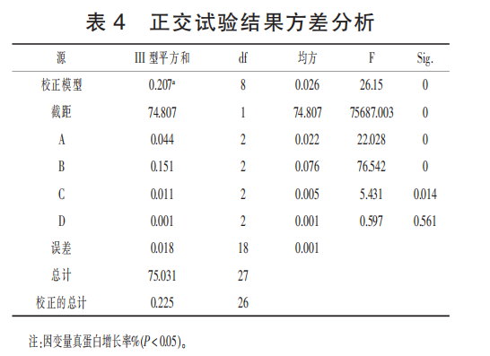 由表 3 得知,4 個要素對有機(jī)化學(xué)氮年增長率危害的層次次序為 B>A>C>D,在其中,硫酸銨加上量對土豆薯渣發(fā)醇生產(chǎn)制造菌 體蛋白質(zhì)飼料中真蛋白質(zhì)成分提升 的危害較為明顯, 次之為薯渣與麥麩的品質(zhì)占比組成與塑造溫度,危害很小的要素為塑造時間。 最適合固態(tài)發(fā)酵生 產(chǎn)菌體蛋白質(zhì)飼料的加工工藝搭配為 A2B2C2D1。 即薯 渣與麥麩的品質(zhì)例為 85S 15F, 硫酸銨加上量為2%,塑造溫度 32 ℃,塑造時間 72 h。 根據(jù)正交實驗方差分析結(jié)果顯示(表 4),前三個要素 A、B、C 對土豆薯渣發(fā)醇生產(chǎn)制造菌體蛋白質(zhì)飼料真蛋白質(zhì)提高 率的危害均具備明顯差異水準(zhǔn)(P < 0.05),要素D 對真蛋白質(zhì)年增長率的危害差別不明顯,因而,挑選 短期內(nèi)固態(tài)發(fā)酵省時省經(jīng)濟(jì)發(fā)展成本費且成效顯著。
