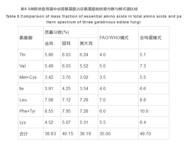 本探討將3種膠原纖維食用菌菌種必須氨基酸 EAA 值與FAO/WHO方式譜和蛋白質(zhì)食物全生雞蛋方式譜中相對(duì)應(yīng)碳水化合物的 EAA值實(shí)現(xiàn)較為,結(jié)果見表5。3種膠原纖維食用菌菌種的必須氨基酸總產(chǎn)量均高過FAO/WHO碳水化合物方式,小于蛋白質(zhì)食物全生雞蛋方式。白木耳中除Lys比FAO/WHO方式譜略低外,別的必須氨基酸的EAA值均高過FAO/WHO方式譜;金耳、木耳中Met Cys、Ile和Lys的EAA值小于FAO/WHO方式譜,Thr、Val、Leu、Phe Tyr的EAA值均高過 FAO/WHO方式譜。跟全生雞蛋方式譜對(duì)比,3種膠原纖維食用菌菌種試品除開Thr高過全生雞蛋方式外,別的必須氨基酸的EAA 值均小于方式譜。一般來說,天然性蛋白質(zhì)常相對(duì)性缺乏磷酸氫鈣、蛋氨酸、蘇氨酸和谷氨酸等必須氨基酸,因此 其營(yíng)養(yǎng)成分相比較低。而檢驗(yàn)發(fā)現(xiàn)3種膠原纖維食用菌菌種中的蘇氨酸成分較高,都高過FAO/WHO方式譜和蛋白質(zhì)食物全生雞蛋方式譜中蘇氨酸的 EAA值,而蘇氨酸也是麥子、稻米、燕麥片等主要食品的第二限定碳水化合物。在具體運(yùn)用中,可考量將食用菌菌種和正餐或別的食材混和服用,以完成蛋白的相輔相成功效,提升 食材蛋白營(yíng)養(yǎng)成分。