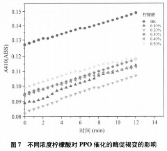 檸檬酸鈉對土豆PPO的活力具備明顯地鈍化處理功效,當管理體系檸檬酸鈉濃度值為0.20%時,OD值最少,表明抑止褐變的功效最好。檸檬酸鈉做為一種酸堿性有機物,可水解造成3個H ,減少管理體系pH,并且是土豆PPO活性中心Cu2 的抗氧化劑,毀壞活性中心,因而檸檬酸鈉的多重功效可合理鈍化處理土豆PPO活力,是抑止土豆褐變的常見緩聚劑。由圖7得知,當管理體系檸檬酸鈉濃度值超出最好抑止?jié)舛戎?.20%后,褐變度有一定的回暖,并并不是檸檬酸鈉濃度值越高對PPO活力的鈍化處理實際效果越好。