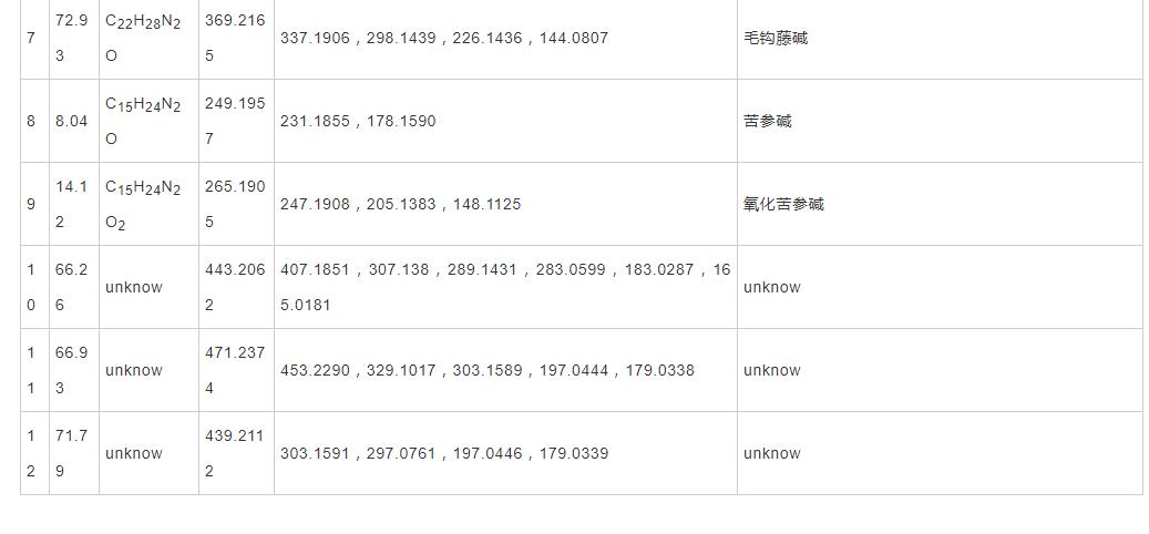 化學(xué)物質(zhì)9:來自玄參和山豆根(苗),保存期14.12 min,共價(jià)鍵方式,其準(zhǔn)分子離子為m/z265.190 5 ,二級質(zhì)譜分析表明其關(guān)鍵殘片m/z247.190 8 ,m/z205.138 3 ,m/z 148.112 5 融合參考文獻(xiàn)基本推斷化學(xué)物質(zhì)9為氧化苦參堿。