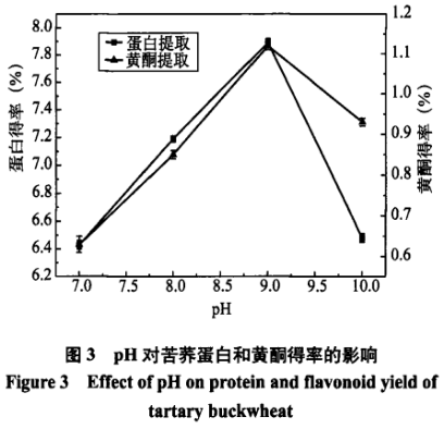 在偏堿情況下超聲波同歩獲取苦蕎麥蛋白質(zhì)和黃酮類化合物,伴隨著pH的擴(kuò)大二者的提取率也隨著擴(kuò)大,表明偏堿標(biāo)準(zhǔn)有益于苦養(yǎng)蛋白質(zhì)和黃酮類化合物的總混。當(dāng)pH為9時(shí),蛋白質(zhì)得率超過最高值7.89%,黃酮類得率最高值1.12%。但伴隨著pH的再次擴(kuò)大二者的提取率均呈下降趨勢(shì)。這是由于苦蕎麥蛋白質(zhì)在強(qiáng)酸自然環(huán)境下能造成水解反應(yīng)、脫氨及其脫羧反應(yīng)等反映,危害理化性質(zhì),毀壞蛋白質(zhì)的功能,造成 蛋白明顯轉(zhuǎn)性。pH過高就會(huì)直接影響商品顏色及其發(fā)生其它不良反應(yīng),在酸沉全過程中也會(huì)使水溶液中鹽份提升,產(chǎn)生鹽溶狀況。充分考慮產(chǎn)品成本及其環(huán)境保護(hù)等要素,采用pH為9的水溶液開展苦蕎麥蛋白質(zhì)和黃酮類化合物的較佳獲取標(biāo)準(zhǔn)。