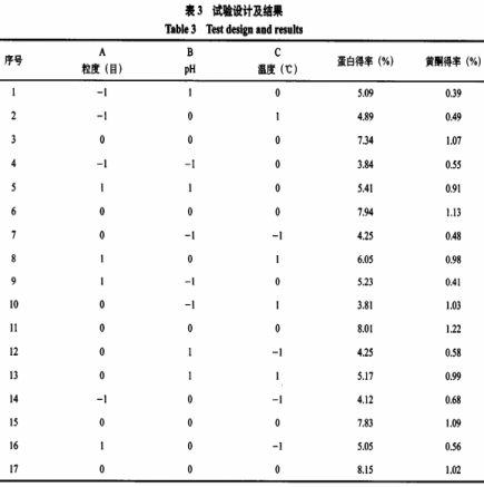 以Box—Benhnken的核心組成實(shí)驗(yàn)結(jié)構(gòu)設(shè)計(jì)為根據(jù),依據(jù)單要素實(shí)驗(yàn)結(jié)果,挑選粒度分布(A)、pH(B)、溫度(C)開展三要素三水準(zhǔn)響應(yīng)面設(shè)計(jì)方案同歩獲取苦蕎麥中烏麥蛋白質(zhì)和黃酮類化合物。要素編號(hào)水準(zhǔn)表見表2,試驗(yàn)設(shè)計(jì)及結(jié)果見表3。