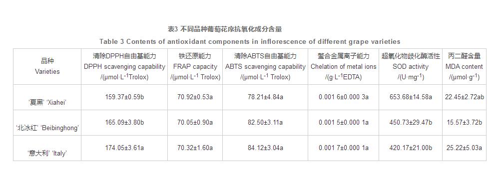 由表3得知,消除DPPH氧自由基工作能力以‘西班牙’最強(qiáng),為174.05 μmol/L Trolox, 明顯強(qiáng)過(guò)其他2個(gè)種類;各種類花序的鐵復(fù)原工作能力基本一致,差別不明顯;消除ABTS氧自由基工作能力以‘西班牙’最強(qiáng),為84.12 μmol/L Trolox, ‘夏黑’最少,為78.21 μmol/L Trolox, 但種類間差別不明顯;3個(gè)品類的花序鰲合金屬離子工作能力均較低,均值為0.001 6 g/L EDTA;SOD活力以‘夏黑’最強(qiáng),為653.68 U·mg-1,明顯高過(guò)‘北冰紅’和‘西班牙’;MDA成分以‘西班牙’最大,為25.22 μmol/g,明顯高過(guò)‘北冰紅’,但與‘夏黑’無(wú)明顯差別。