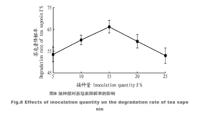 不一樣接種量對茶皂素溶解率的危害如圖所示8所顯示。由圖8得知,不一樣接種量對茶皂素溶解率危害明顯。當(dāng)接種量為15%時,茶皂素溶解率較大 ,做到66.19%;當(dāng)接種量低于15%時,茶皂素溶解率隨接種量的提高而提升;當(dāng)接種量超過15%時,茶皂素溶解率隨接種量的提高而減少。若注射過多,發(fā)醇早期菌體數(shù)量大,菌體很多生長發(fā)育使?fàn)I養(yǎng)元素耗費過快,且液態(tài)種籽液的副產(chǎn)品太多,造成 發(fā)醇延滯期增加,進而造成同樣的發(fā)醇周期時間茶皂素溶解率減少。因而,挑選15%做為最好接種量,用以事后科學(xué)研究。