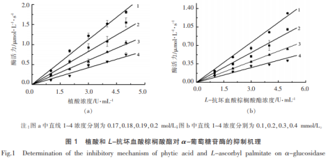2效用物對(duì)α-葡萄糖苷酶的抑止原理植酸和L-抗壞血酸豆蔻酸酯對(duì)α-葡萄糖苷酶抑止原理如圖所示1所顯示。圖上的曲線圖均給予起點(diǎn),直線斜率各自隨效用物濃度值增高而減少。因而,2種效用物對(duì)α-葡萄糖苷酶均為交叉性抑止,效用物與酶以非共價(jià)鍵融合成可離解的一氧化氮合酶。在該酶活管理體系的測(cè)量中盡管酶催化反應(yīng)速度速度減少,可是沒(méi)有降低合理酶量。