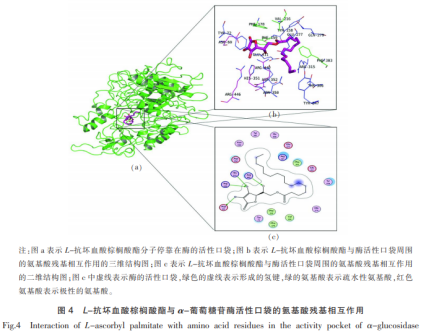 L-抗壞血酸豆蔻酸酯與α-葡萄糖苷酶活力袋子的氨基酸殘基相互影響如圖4所顯示。由圖4b,4c能夠看得出,L-抗壞血酸豆蔻酸酯的分子式,一端為含有酚羥基的苯環(huán),接著相互連接的是較長(zhǎng)碳鏈構(gòu)造。含有酚羥基苯環(huán)一端進(jìn)到酶的活性袋子房屋朝向氨基酸殘基His315,Arg442,Arg446,Asp69,并與4個(gè)氨基酸殘基產(chǎn)生共價(jià)鍵。共價(jià)鍵產(chǎn)生的越大,配位分子結(jié)構(gòu)與酶融合越平穩(wěn)。全部配位分子結(jié)構(gòu)進(jìn)到酶的活性袋子中,因?yàn)樘兼溳^長(zhǎng),進(jìn)到活力袋子必須 扭曲和變化姿態(tài)及擺脫室內(nèi)空間阻攔而耗費(fèi)大量的動(dòng)能。除此之外,配位分子結(jié)構(gòu)L-抗壞血酸豆蔻酸酯的尾端房屋朝向Phe303,Phe159,Val216,Phe178疏水性碳水化合物,產(chǎn)生親水性相互影響。配位分子結(jié)構(gòu)L-抗壞血酸豆蔻酸酯與周邊的氨基酸殘基Tyr72,Gln279,Tyr158,Asp352,Asn350,Tyr347,Thr306,Glu277,Arg315,Glu411產(chǎn)生范德華力。L-抗壞血酸豆蔻酸酯與α-葡萄糖苷酶的活力袋子周邊的碳水化合物十分平穩(wěn)的融合。