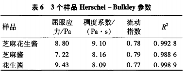 由表6能夠看得出,白芝麻番茄醬、麻醬、番茄醬 的Herschel-Bulkley方程式相關(guān)系數(shù)r均在0.98之上, 關(guān)聯(lián)性非常好,屈服應力尺寸為番茄醬>芝麻花生 醬>麻醬。屈服應力值可以用以說明逐漸流動性的難 易水平,即番茄醬逐漸流動性較難,而麻醬最非常容易; 砂漿稠度指數(shù)與試品粘稠度成正比例關(guān)系,因而3個樣 品的粘稠度尺寸次序為白芝麻番茄醬>麻醬>花生仁 醬;而流動性指數(shù)值是考量液體假塑性水平的指標值,3個 試品流動性指數(shù)值均低于1,則3個試品均為假塑性 液體。