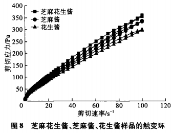 對白芝麻番茄醬開展流變學剖析發(fā)覺,白芝麻番茄醬是假塑性液體,合乎Herschel-Bulkley方程式;白芝麻番茄醬的觸變環(huán)總面積低于麻醬,表明白芝麻番茄醬的流變學可靠性好于麻醬,口味更細致溫和。 感觀點評層面,白芝麻番茄醬試品在香氣、口味、整體具體性層面好于純芝麻醬、純番茄醬,試品甜 香醇正,口味更好,接受程度高些。